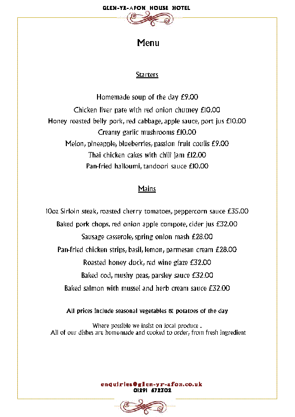 In this respect the restaurant is spoilt for choice, as Monmouthshire and its surrounding counties can boast a plethora of local suppliers providing all manner of delicious foods from unique cheeses and wines, famous Welsh beef and lamb, to fresh fish and seafood. Dinner is served between 6.30pm and 8.30pm.
